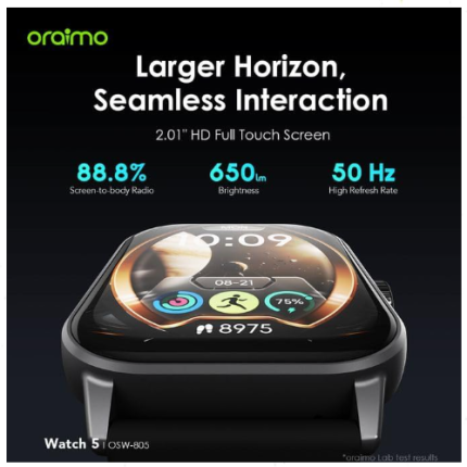 ساعة ذكية Oraimo Watch 4 Plus OSW-801 للمكالمات – شاشة 2.01 HD، قياس ضغط الدم والأكسجين (SpO2)، مقاومة IP67، تدعم العربية + ضمان 12 شهر.