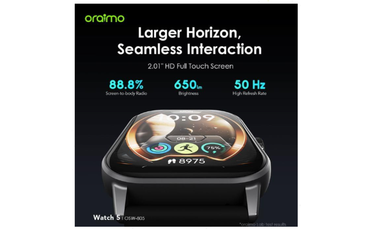 ساعة سمارت مكالمات Oraimo Watch 5 Lite OSW-804 | مقاس 49 مللي | قياس نبض وأكسجين | ضمان 12 شهر – اربستا